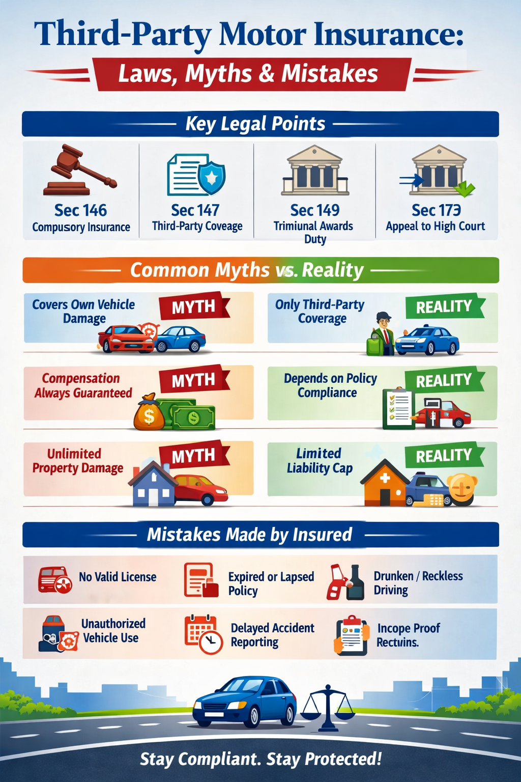 Learn about third‑party motor insurance laws in India, common myths, and mistakes insured individuals make that lead to claim rejection. Stay compliant to protect your rights and secure fair compensation.
